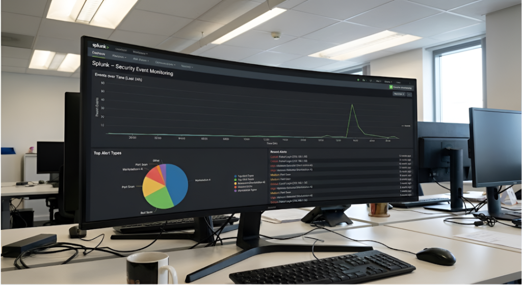Splunk collects and analyzes logs from servers, applications, firewalls, and security tools.